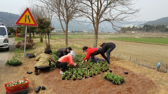 회화면(면장 우정수)은 2016경남고성공룡세계엑스포 개막을 맞아 엑스포를 찾는 관광객에게 봄 향기를 전하기 위해 지난 23일, 꽃동산 조성활동을 펼쳤다.