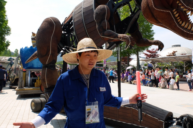 또한, 행사 진행 요원으로 근무 중인 이강열 군은 상설무대에서 펼쳐지는 서커스, 마술 등 각종 공연 관람에 차질이 없도록 행사 준비와 관람객 안내를 돕고 하루 세 번 공룡분수대 일원에서 펼쳐지는 공룡 퍼레이드 때는 관람객들의 안전을 위한 질서유지에 힘쓰고 있다.