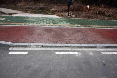 ▲ 제대로 도로를 정비하게 되면 저 보행자도로도 없어져야 할 것 같다. 자동차가 다녀 대리석이 파손되고 보도블럭도 내려앉고 균열이 생겼다. |
