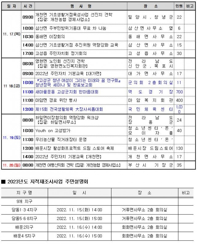 고성군 주간행사예정표(2022. 11. 14. ~ 11. 20.)