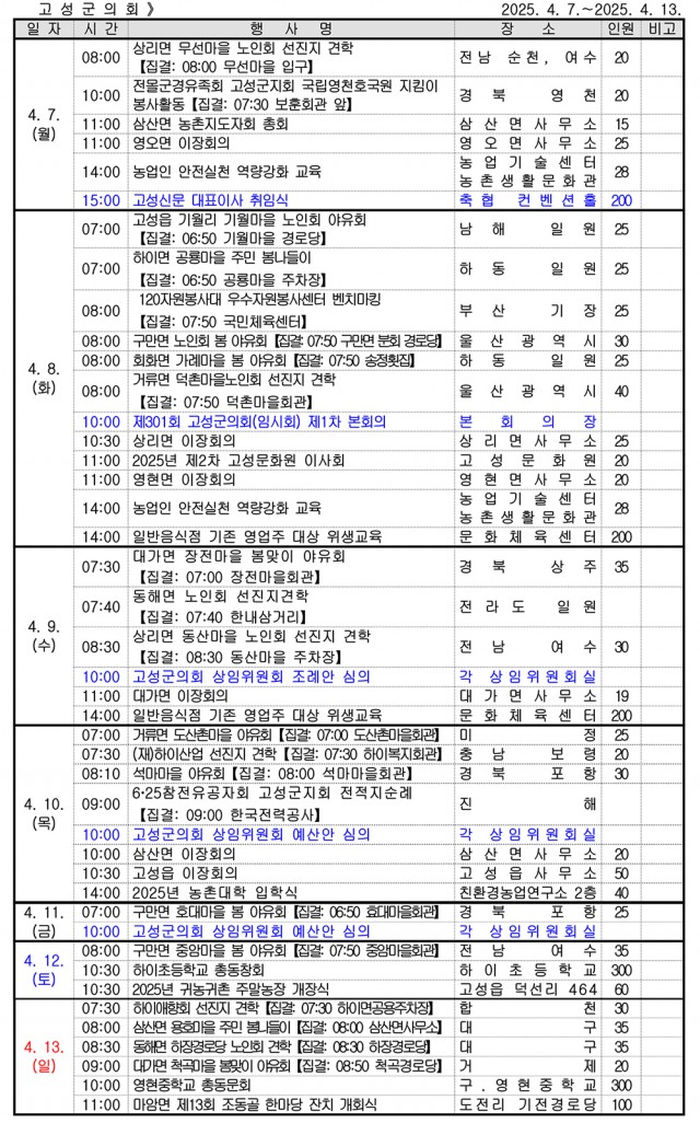 고성군 주간행사예정표(2025. 4. 7. ~ 4. 13.)
