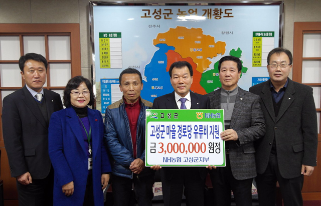 NH농협 고성군지부 (지부장 권창문)는 1월 7일 고성군 관내 정부지원을 받지 못하는 미등록 경로당 10곳을 대상으로 3백만 원의 난방비를 지원하는 전달식을 가졌다.