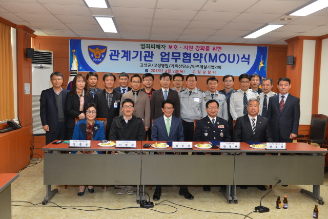 고성경찰서 ( 서장 함현배 ) 는 4 월 2 일 ( 수 ), 고성군 , 고성군 가족상담소 , 고성병원 , 바르게살기 고성군 협의회 등 4 개 유관기관과 피해자 보호 ․ 지원 강화를 위한 업무협약 (MOU) 을 체결했다 .