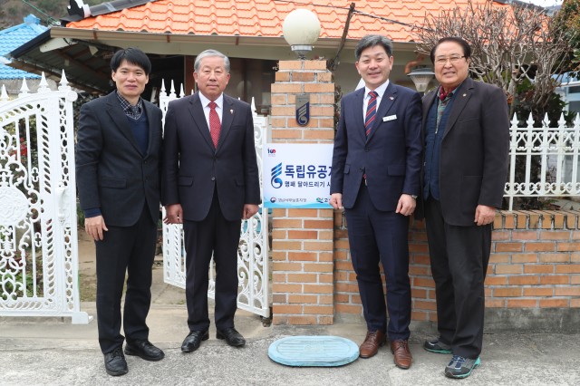18일 오후, 백두현 군수와 박용삼 군의회 의장, 김덕석 경남서부보훈지청장은 대가면에 살고 있는 심재인 애국지사의 아들 심진표 씨의 집을 찾아가 ‘독립유공자의 집’ 명패를 달아 주었습니다.