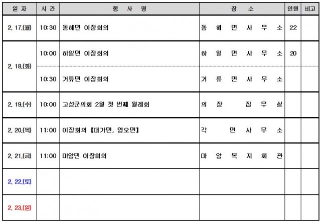고성군 주간행사예정표(2020. 02. 17 ~ 02. 23)