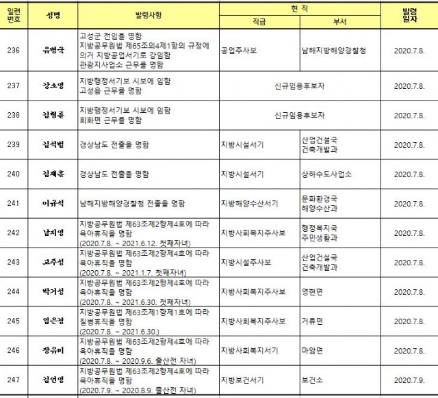 고성군 2020년 하반기 정기인사 발령
