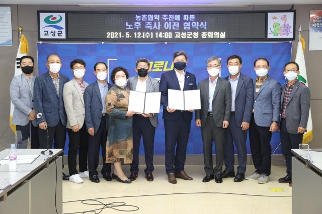 고성군이 오래되고 낡은 축사로 손상된 마을을 회복시키는 사업을 벌이기로 하고, 고성군과 대한한돈협회, 고성지부와 농장대표들은 5월 12일, 고성군청 회의실에 모여 협약을 체결하고 낡은 축사를 옮기기로 했습니다.