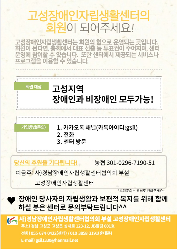 장애인자립생활지원센터에서는 장애인이라는 이유로 차별받지 않고 이들이 사회 구성원으로 자립해 나갈 수 있는 사회를 만들기 위해 고성지역 장애인의 자립생활과 보편 복지 실현에 관심을 갖고 함께할 뜻이 있는 활동가들을 모집하고 있다. 회원자격은 장애 유무를 떠나서 고성에 살고 있는 군민이라면 누구나 회원으로 등록할 수 있다.