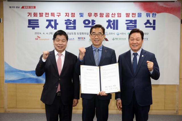 4일, 경남도청에서 열린 ‘기회발전특구 지정과 우주항공산업 발전을 위한 투자 협약식’에서 고성군과 경남도, SK오션플랜트와 투자협약을 맺었다.