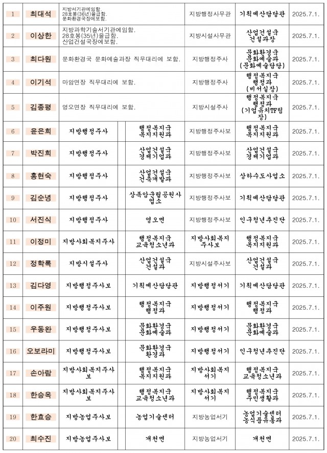 이번 정기인사는 △4급 2명(기획예산담당관 최대석, 건설과장 이상한) △5급 3명(행정과 이기석·김종평, 문화예술과 최다원) △6급 7명 △7급 10명 △8급 24명을 포함해 46명이 승진하고 138명이 전보됐는데, 모두 270여 명에 대한 인사를 실행했다.