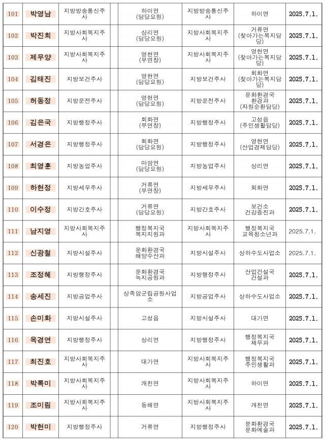 고성군(군수 이상근)은 2025년 7월 1일 자로 승진·전보를 포함한 2025년 하반기 정기인사를 실행 발표했다.