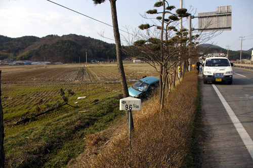 오늘(22일) 오전 8시 10분경 국도 14호선 고성에서 배둔 방향 보전리 동정마을 입구 부근에서 고성에서 마산 쪽으로 향해 달리던 마티즈 승용차가 앞서가는 차를 들이받은 뒤, 오른쪽 논으로 굴러들어간 사고가 발생했다.