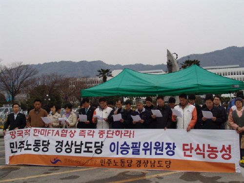 “체결의 실리도 명분도 없는 韓美FTA 이제 끝내야 한다. 오늘까지 12일째 문성현 당대표는 청와대 앞에서 눈보라를 맞으며 노상단식농성을 하고 있다. 민주노동당 경남도당은 경남지역 뜻있는 시민 사회단체 지도자들과 회원들, 320만 경남도민들을 믿고 韓美FTA 협상 중단을 위한 투쟁에 앞장서 나갈 것이다”고 밝혔다.