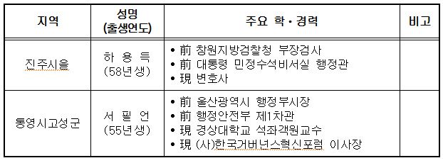 경남지역 국회의원선거구 조직위원장 1차 선정결과(2곳)