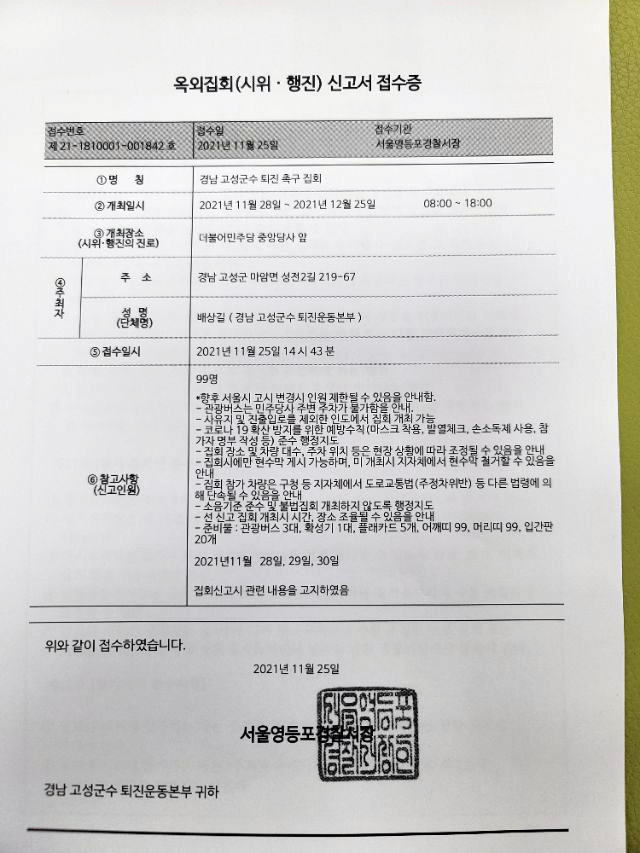 백두현 군수 퇴진을 요구하며 단식농성에 들어갔던 배상길 의원이 11월 26일 서울 영등포경찰서를 찾아가 옥외집회 신고서를 접수하고 군수 퇴진 시위를 계속 이어나가기로 했다.
