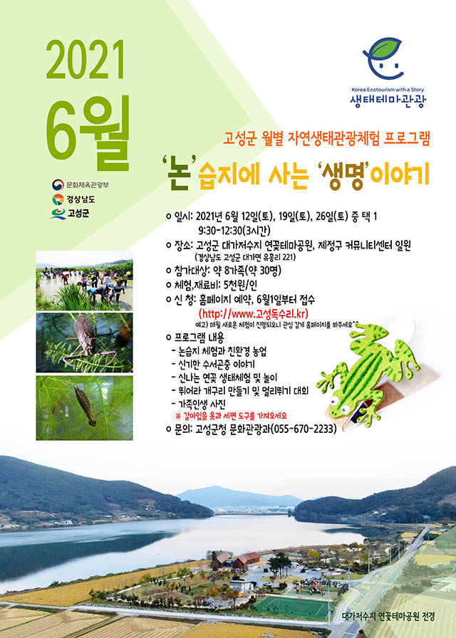 이번 6월 프로그램은 12일, 19일, 26일 오전 9시 30분부터 오후 12시 30분까지 고성군 대가저수지 연꽃주제공원과 제정구 공동체건물 일원에서 ‘논’ 습지에 사는 ‘생명’ 이야기를 주제로 열린다.