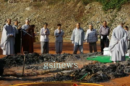 어제 11시에 영결식을 마치고 곧장 다비식에 들어가 밤새 자신을 태운 정천 스님의 유골은 오늘 아침 7시경부터 본격적인 수습에 들어가 조금 전 8시 50분경에 모든 유골수습 작업을 끝마쳤다.