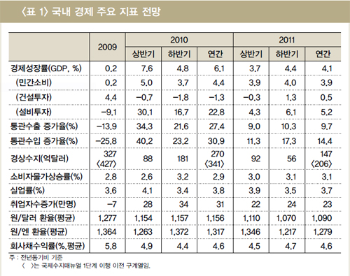 부동산 경기의 반등 조짐에도 불구하고 공공건축과 토목건설의 부진으로 건설투자는 2011년에도 부진을 지속할 전망이다. 자산효과 등에 힘입어 소비는 상대적으로 꾸준한 상승세를 지속할 것으로 예상된다. 2010년 국내 경제성장률은 6% 내외를 기록할 것으로 보이지만 2011년에는 성장률이 4% 내외로 낮아질 전망이다.