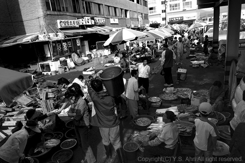 활어들의 힘찬 몸짓에 대야에 담긴 바닷물은 사방으로 비산되고, 흘러넘친 바닷물에 갯내음이 물씬 풍긴다. 분주히 오가는 행인들의 발길, 그와 더불어 능수능란한 점포 주인들의 손길에 생선들은 쉴 새 없이 비늘이 벗겨지고, 적당한 크기로 잘려서는 손님들의 손에 척 안긴다.