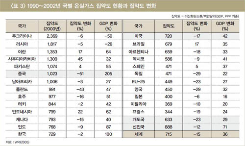 여기에 러시아와 인도가 포함되면 66.4%, 일본과 한국, 캐나다가 포함되면 75%로 전체 배출의 3/4를 차지하게 된다. 이와 같이 전체 15개국의 다배출 국가들에서 전체 온실가스의 85%를 차지하고 있다(<그림 3> 참조).