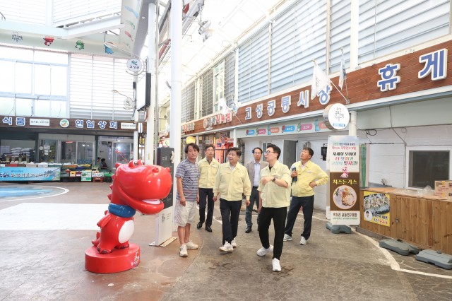 먼저 고성시장과 고성공룡시장을 찾은 이상근 군수는 시장 안 통로 위 천정에 물이 새는지 확인하고 배수로와 지하주차장을 살폈다.