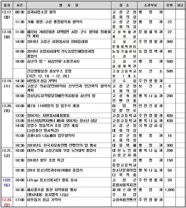 고성군 주간행사예정표(2018년12월17일~12월23일)
