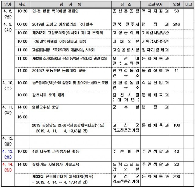 고성군 주간행사예정표(2019년4월8일~4월14일)