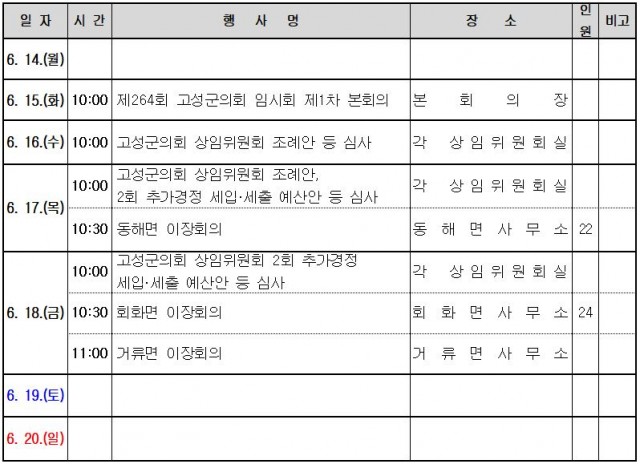 고성군 주간행사예정표(2021. 6. 14. ~ 2021. 6. 20.)
