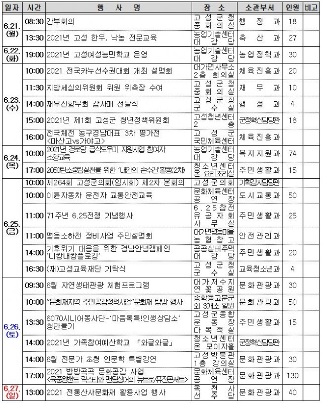 고성군 주간행사예정표(2021. 6. 21. ~ 2021. 6. 27.)