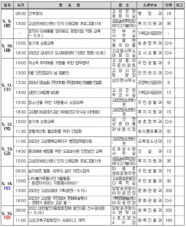 고성군 주간행사예정표(2022. 5. 9. ~ 5. 15.)