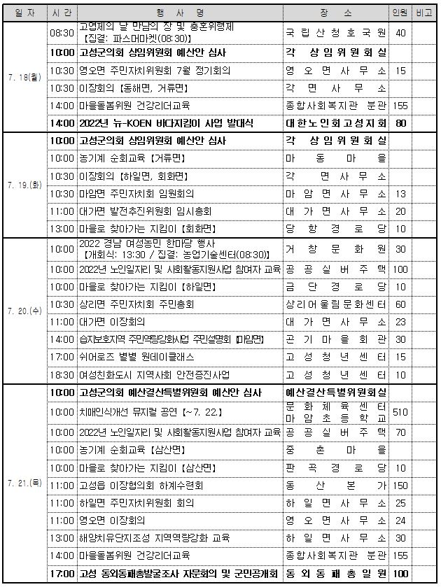 고성군 주간행사예정표(2022. 7. 18. ~ 7. 24.)
