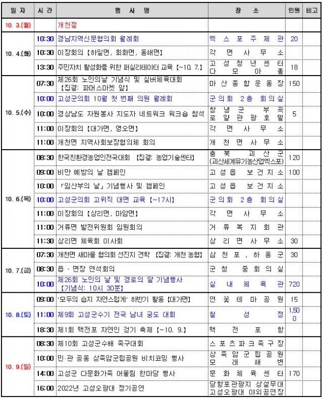 고성군 주간행사예정표(2022. 10. 3. ~ 10. 9.)