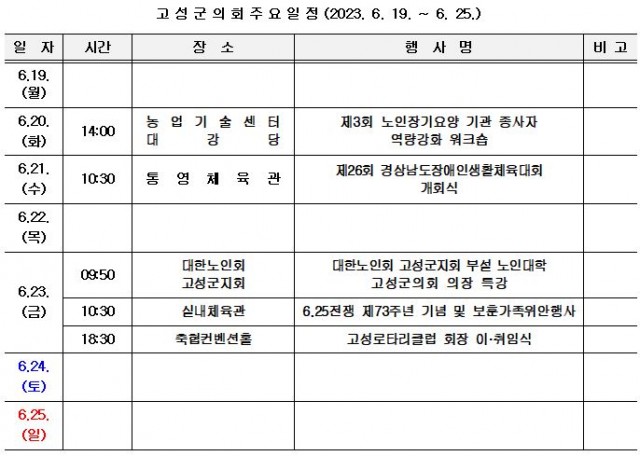 고성군 주간행사예정표(2023. 6. 19. ~ 6. 25.)
