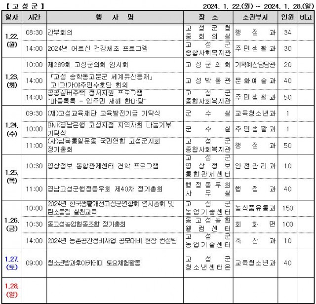 고성군 주간행사예정표(2024. 1. 22. ~ 1. 28.)