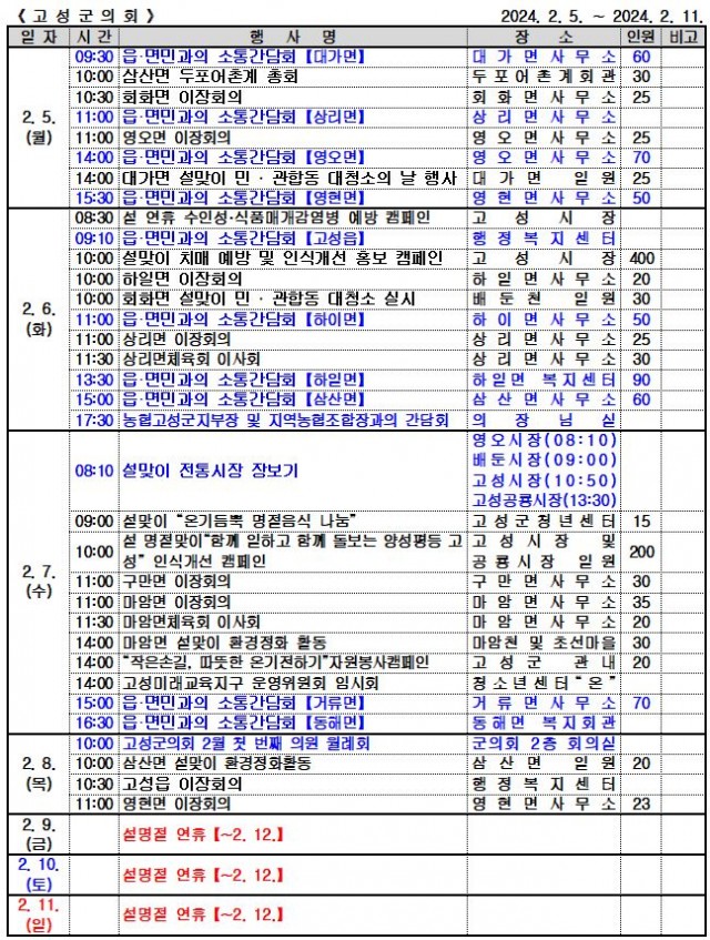 고성군 주간행사예정표(2024. 2. 5. ~ 2. 11.)