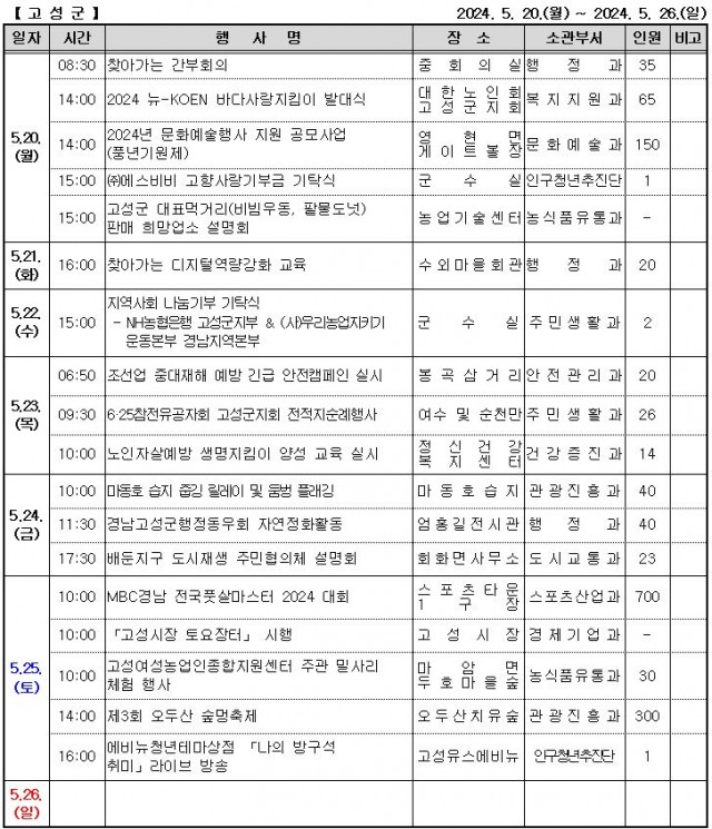 고성군 주간행사예정표(2024. 5. 20. ~ 5. 26.)