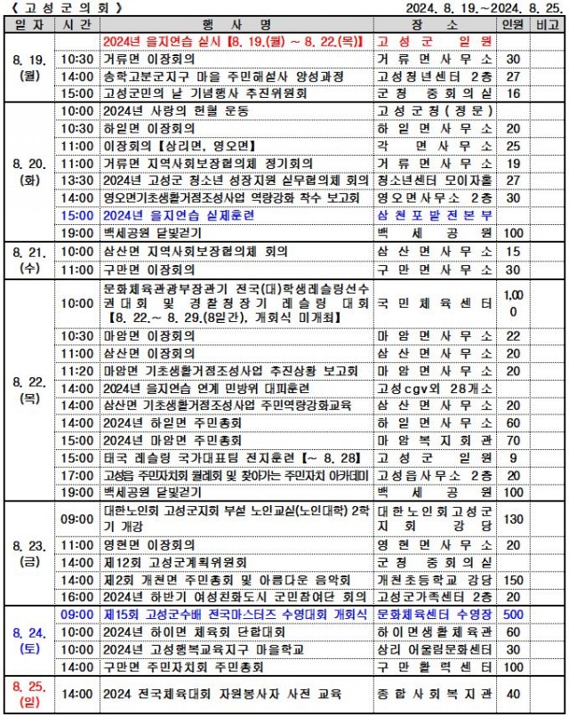 고성군 주간행사예정표(2024. 8. 19. ~ 8. 25.)