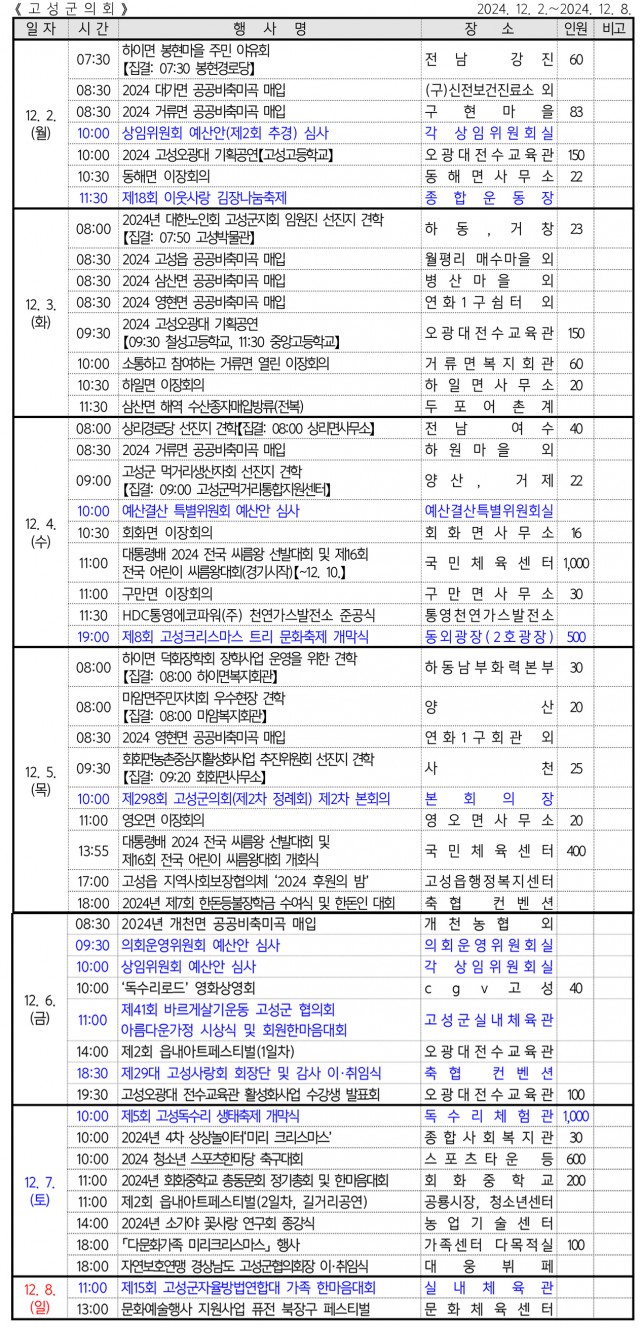 고성군 주간행사예정표(2024. 12. 2. ~ 12. 8.)