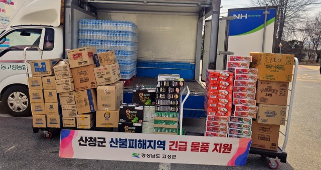 고성군(군수 이상근)이 산청군에서 일어난 산불로 큰 어려움을 겪고 있는 이재민을 지원하기 위해 긴급 구호물품을 전달했다.
