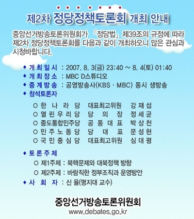 중앙선거방송토론위원회가 정당법 제39조의 규정에 따라 제2차 정당정책토론회를 다음과 같이 개최한다.