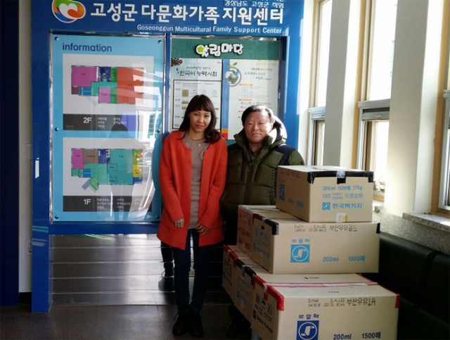 고성군 청산목장(대표 정영환)에서는 12월 17일`` 관내 다문화가족에게 전해 달라며 전지분유 1㎏ 96포를 사회복지공동모금회를 통해 기탁했다.