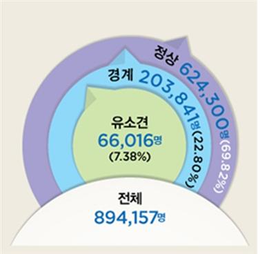 공복혈당 검사 결과 전체 889``301명 중 정상은 623``385명(70.10%)`` 경계는 201``522명(22.66%)`` 유소견은 64``394명(7.24%)으로 나타났다. 또한 당화혈색소(HbA1c) 검사 결과 전체 120``238명 중 정상은 100``403명(83.50%)`` 경계는 12``766명(10.62%)`` 유소견은 7``069명(5.88%)으로 나타났다.